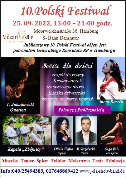 Ich lade Sie herzlich zum 10. Jubiläum des Polnischen Festivals ein, das für drei Generationen ein reichhaltiges künstlerisches Programm bietet.Der Sonntag ist ein großartiger Tag, um unvergessliche Momente mit der ganzen Familie und Freunden in den Farben und Klängen der polnischen Kultur zu erleben.Polnische Künstler präsentieren uns verschiedene Musikrichtungen: POP- KLASSISCHE MUSIK-JAZZ- FOLKLOR. Wir werden auch die Talente der Kinder bewundern.Ich lade alle herzlich in die wunderschönen historischen Säle der Mozartsäle-Hamburg-Dammtor, Moorweidenstraße 36, von 13.00 bis 21.00 Uhr ein.Traditionell beginnen wir gemeinsam mit dem Publikum des Polnischen Festivals mit dem polnischen Nationaltanz -POLONEZ.