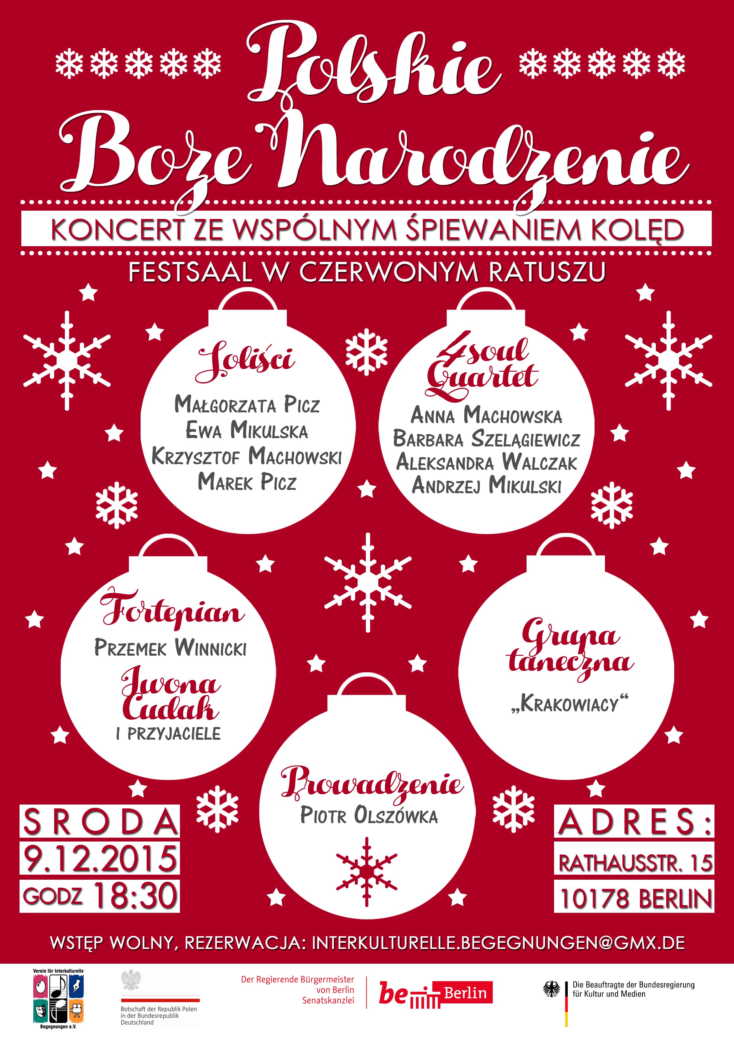 Stowarzyszenie Verein für Interkulturelle Begegnungen e.V., Senat Berlina oraz Wydział Konsularny Ambasady RP w Berlinie zapraszają na koncert "Polskie Boże Narodzenie" przedstawiający polskie zwyczaje, tradycje i muzyke związaną z Bożym Narodzeniem.
