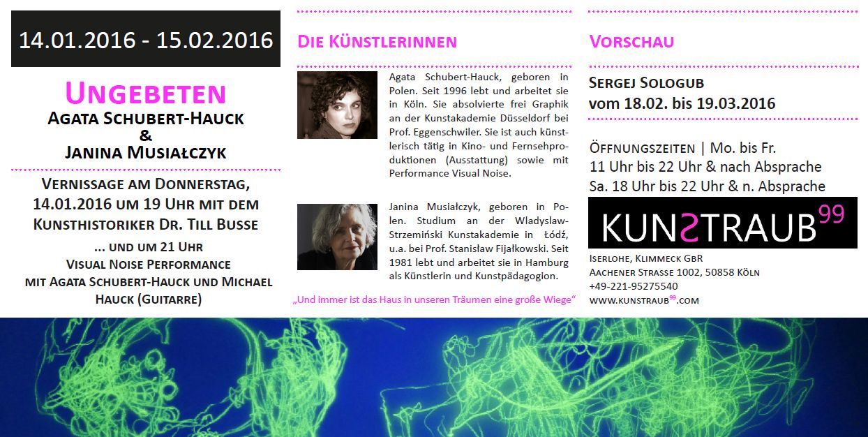 Vernissage & Performance w Kolonii w dniu 14.01.2016 swoje prace zaprezentują dwie polskie artystki w Galerii Kunstraub99. Bardzo serdecznie Państwa zapraszamy i prosimy żeby nasze zaproszenie na Vernissaż przekazali Państwo również swoim znajomym. würden.