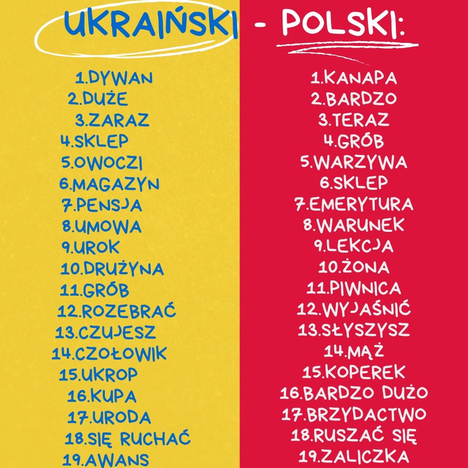 Okazuje się przy tym, że polski i ukraiński mają ponad połowę wspólnego słownictwa. I dlatego – Dzień dobry znaczy Добрий день (dobryj deń), proszę znaczy прошу (proszu) albo будь ласка (budʹ łaska), dziękuję znaczy Дякую (diakuju), przepraszam – znaczy перепрошую (pereproszuju) albo вибачте (wybaczte). A co najważniejsze: tak znaczy tak (tak), a nie znaczy нe (ni), także jesteśmy w stanie się wzajemnie zrozumieć w podstawowych sprawach, bo przecież Słowianie zawsze się jakoś dogadają.