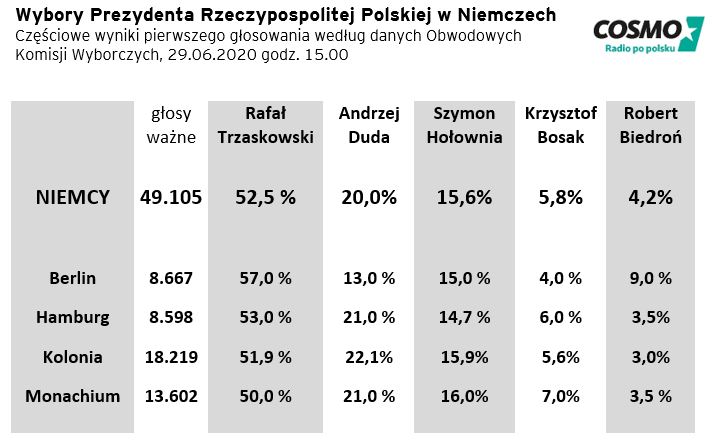 Redakcja Radia Cosmo analizując wyniki wyborów prezydenckich z 28 czerwca br. w Niemczech stwierdza, że Polacy wybrali tu swojego prezydenta już w pierwszej turze. Redaktor naczelny stwierdza, że Rafał Trzaskowski, który w politycznym realu nie jest bez szans, ale by wygrać, musi walczyć o każdy głos. I dalej podkrećla, że w Niemczech we wszystkich obwodach wyborczych pokonał swojego największego konkurenta, zdobywając dwa lub jak w Berlinie nawet cztery razy tyle głosów, co Andrzej Duda.