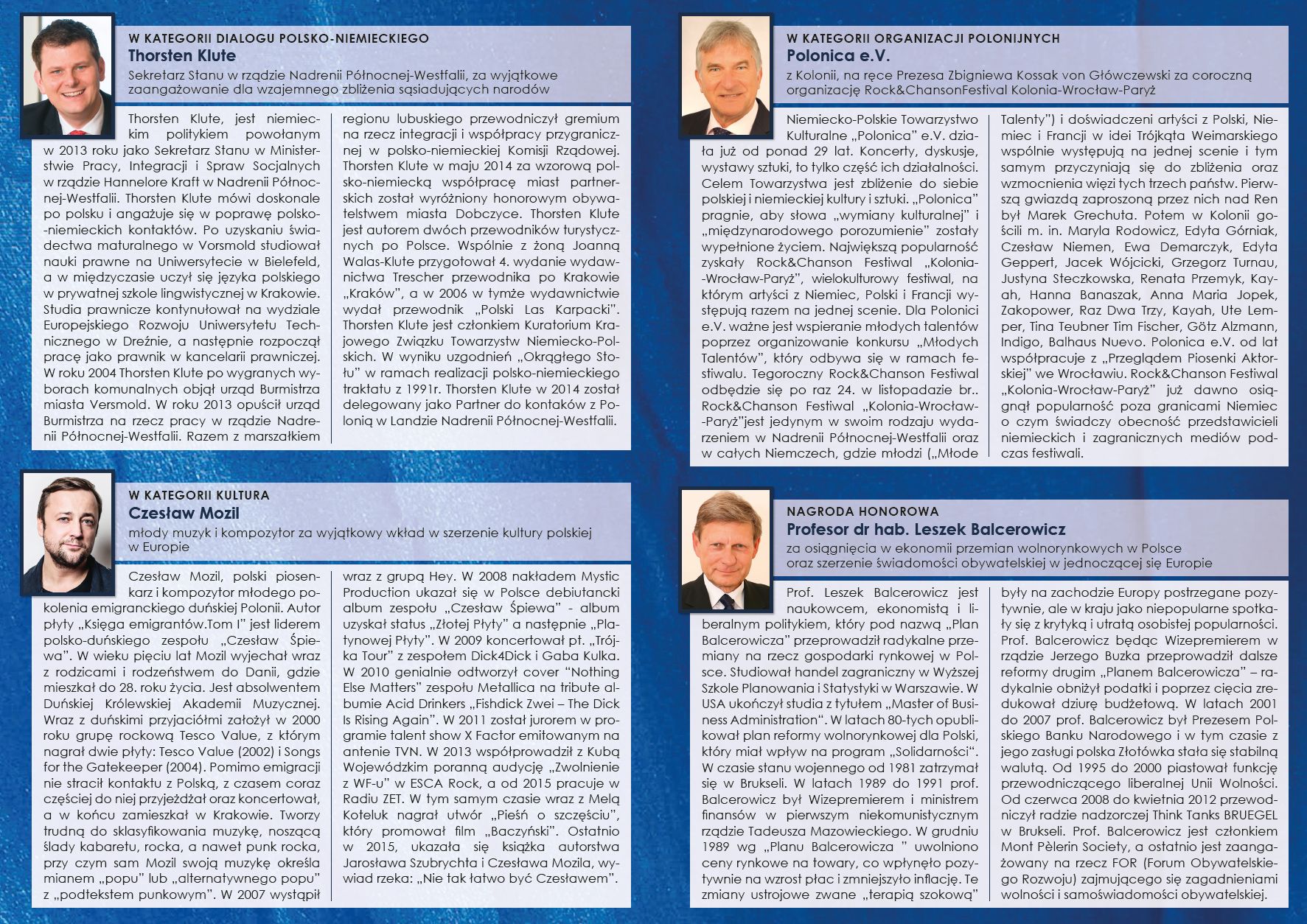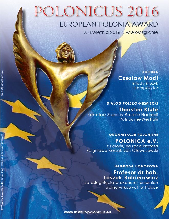 W tym roku uhonorowani zostaną po raz kolejny niezwykle ważni przedstawiciele kręgów opiniotwórczych – polskich, niemieckich, a także mających wpływ na całą Europę: Thorsten Klute – Sekretarz Stanu w Ministerstwie Pracy, Integracji i Spraw Socjalnych Nadrenii Północnej-Westfalii; Czesław Mozil, lider zespołu „Czesław Śpiewa”, przedstawiciel duńskiej Polonii, autor płyty „Księga emigrantów”; niemiecko-polskie Stowarzyszenie Kulturalne POLONICA e.V. z Kolonii na czele z jego prezesem Zbigniewem Kossakiem von Główczewskim, organizatorem festiwalu „Chanson Festival Kolonia-Wrocław-Paryż”. Nagrodę honorową POLONICUS 2016 otrzyma profesor Leszek Balcerowicz, przewodniczący Rady Forum Obywatelskiego Rozwoju, były wicepremier, minister finansów, prezes Narodowego Banku Polskiego, za wybitne osiągnięcia w ekonomii przemian wolnorynkowych w Polsce oraz za wyjątkowy wkład w szerzenie świadomości obywatelskiej w jednoczącej się Europie.