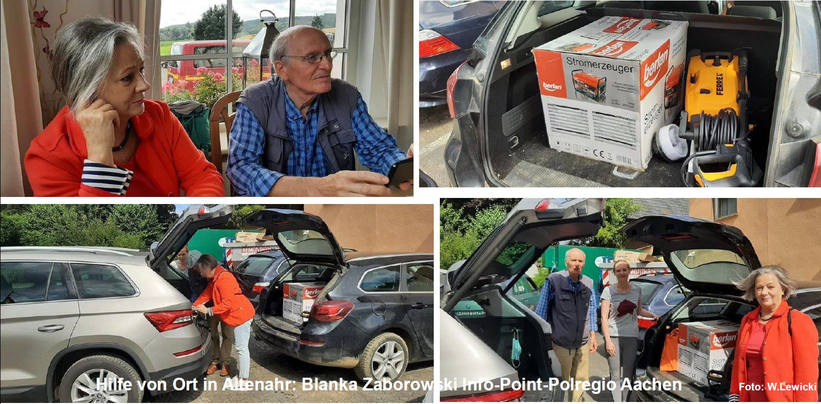 Pomoc polegała na szybkim netzwerku i przekazywaniu informacji, np. od Info Pointu Kolonia do WOŚP w Bonn. Setki ludzi chętnych do pomocy, wyjątkowy odzew, jeden post uruchomił falę dobroci. Konsulat RP oferował pomoc poszkodowanym, także finansową. „WDR”, „Deutsche Welle”, wszystkie tutejsze media polonijne rozprzestrzeniały informacje odnośnie pomocy. Nastąpiły zbiórki rzeczy, żywności, ubrań, zabawek, pościeli, transportu itp. Pomoc psychologiczna nadeszła także z Hesji, od Barbary Lange z inicjatywy "Daj Znak".