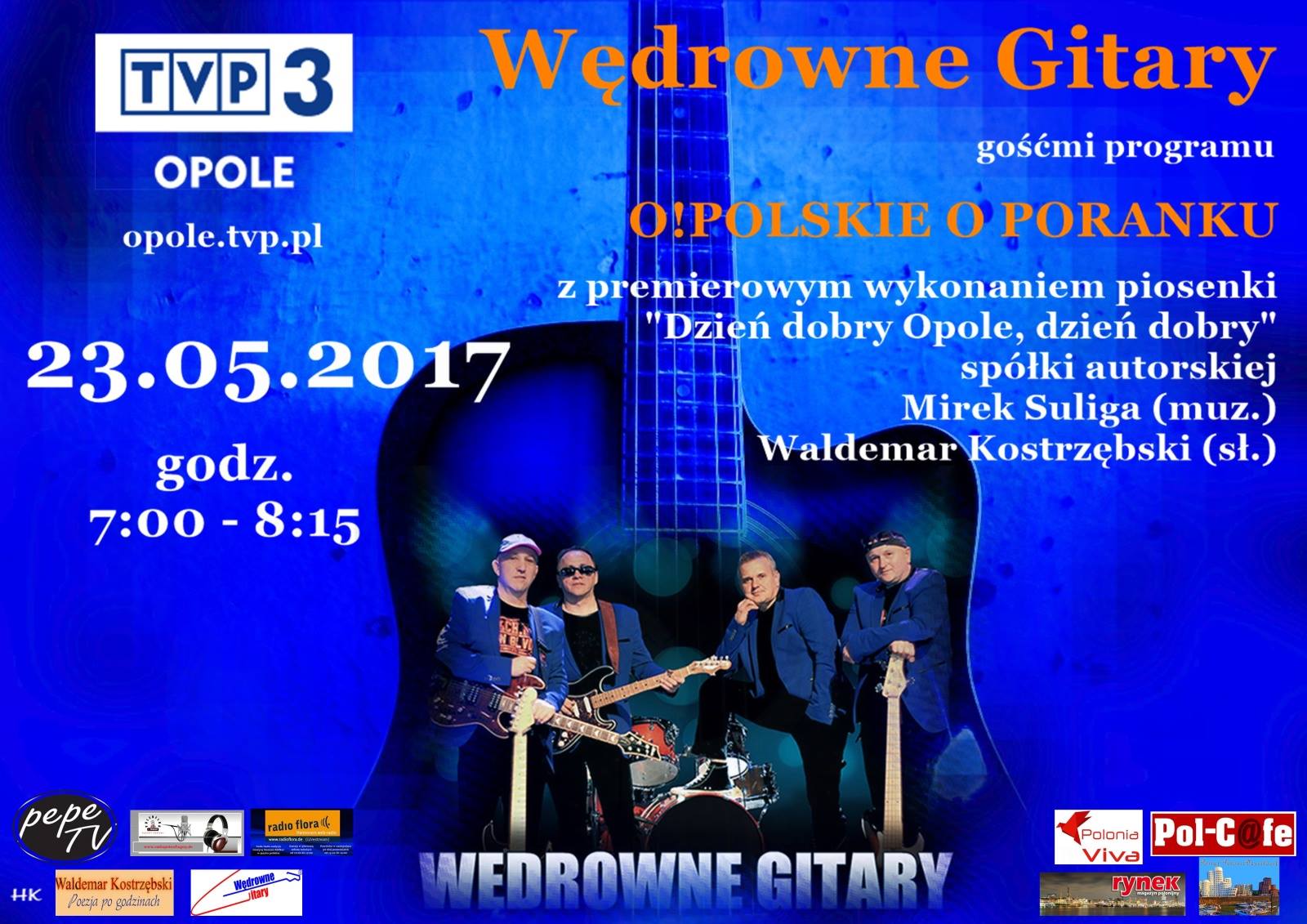 Mirek Suliga wraz z grupą "Wędrowne Gitary" oraz Waldemar Kostrzebski otrzymali zaproszenie do udziału w programie "O!polskie o poranku", codziennej, porannej audycji, emitowanej w TVP3 Opole od poniedziałku do piątku od 7.00 do 8.15. Po raz pierwszy w publicznej telewizji zaprezentowana będzie piosenka "Dzień dobry Opole, dzień dobry", kompozycja Mirka Suligi do tekstu Waldemara Kostrzebskiego. Autor tekstu niestety nie może przyjechać do Polski na nagranie programu, dlatego także wrozmowie wezmą udział kompozytor i lider grupy Mirek Suliga. Zapraszamy do oglądania i słuchania. Cały program po otrzymaniu materiału filmowego od redakcji TVP3 Opole będzie dostępny na blogu Waldemara Kostrzebskiego.