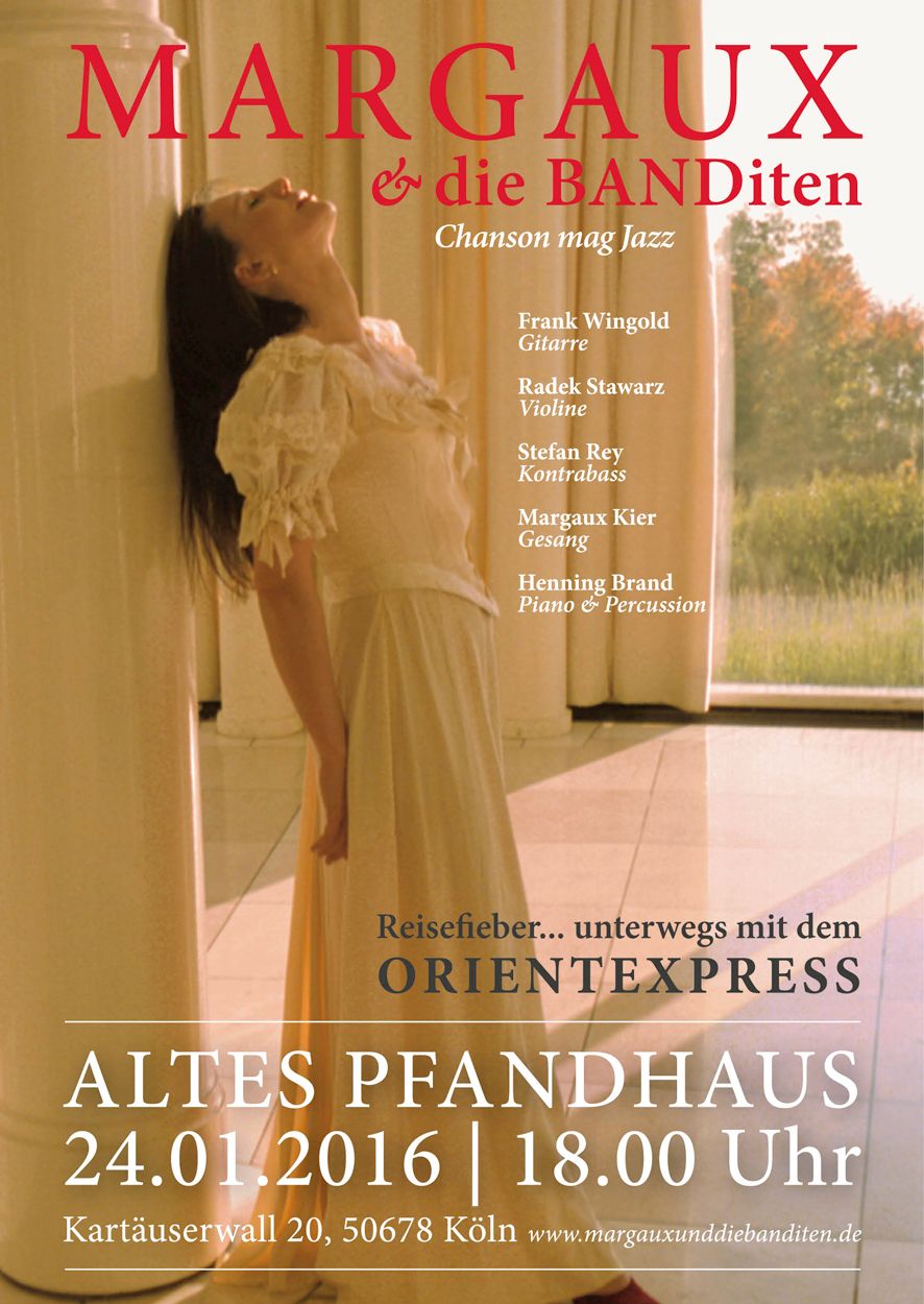 Legendarny Orient-Express zainspirował już wielu autorów do opowieści i anegdot - nie tylko sławną autorkę kriminałów Agatę Christie. Margaux Kier szarmancka szansonistka, aktorka i wokalistka jazzowa mieszkająca w Kolonii, a wywodząca się z Polski opowiada kilka tych historii w swoim nastrojowym programie "Niepokój … podróż w Orient-Ekspresie". Zmysłowa podróż prowadzi przez kraje wzdłuż szlaku pociągu tęsknoty za dalekim światem… BANDyci - jej długoletni towarzysze na muzycznej drodze akompaniują wyśmienicie do więcej lub mniej typowych piosenek w dziewięciu językach: Frank Wingold (gitara), Radek Stawarz (skrzypce), Henning Brand (piano, melodika & percusja) i Stefan Rey (kontrabas).