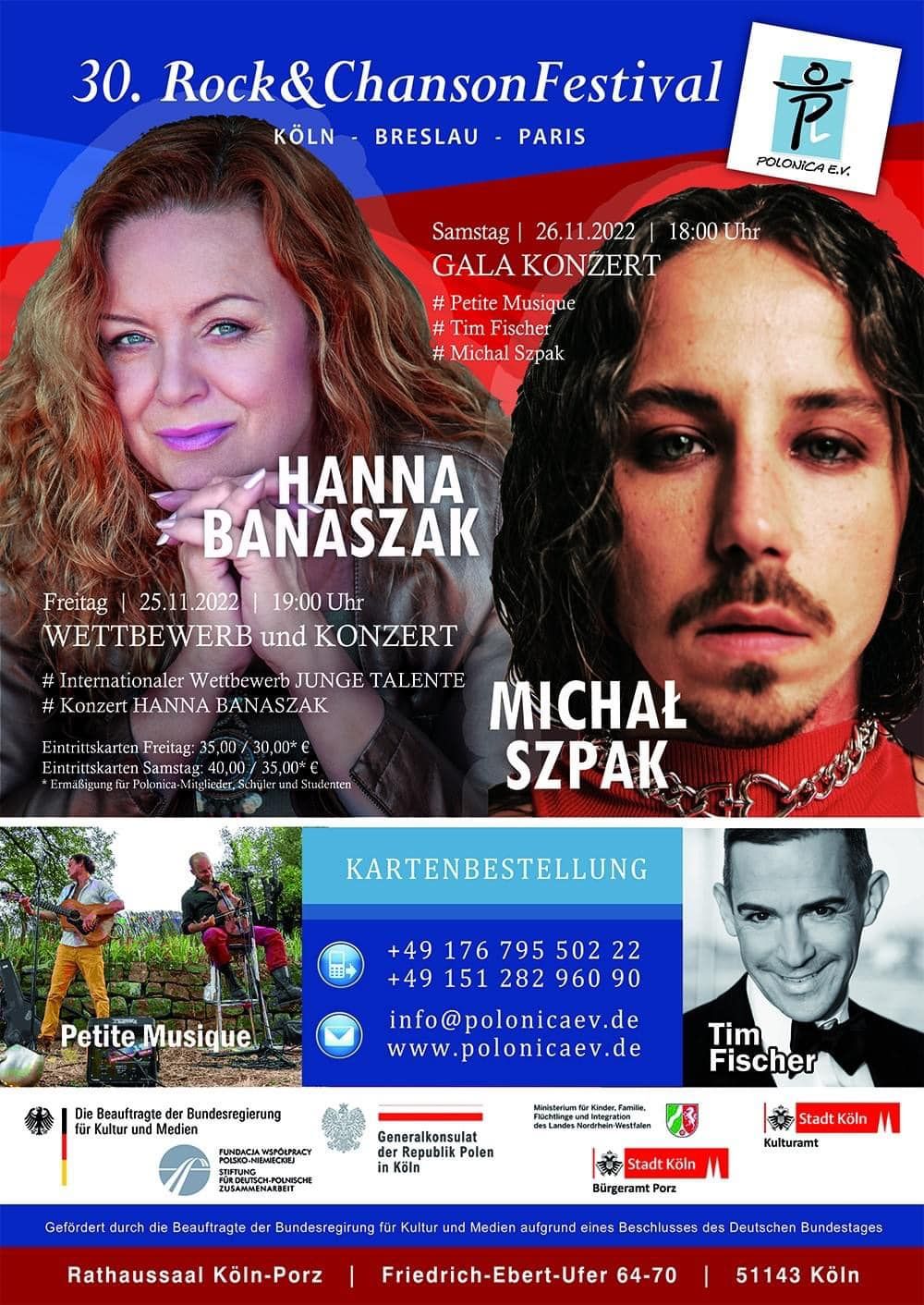 W tym roku odbędzie się jubileuszowy 30. Rock&Chanson Festiwal „Kolonia-Wrocław-Paryż”. 25 i 26 listopada na scenie sali ratuszowe w Köln-Porz, polsko-niemieckie Towarzystwo Kulturalne „Polonica” e.V. zaprezentuje mieszankę młodych oraz znanych i lubianych artystów.