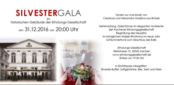 Zapraszamy po raz kolejny na Galę Sylwestrową w przepięknej „Sali Balowej” zameczku Stadtpalais Erholungsgesellschaft z wyśmienitym jak zwykle cateringiem Event Probat. Stadpalais położony jest w centrum Aachen, naprzeciw Elisenbrunnen wejście od drugiej strony przy Elisengalerie. Oprawę muzyczną zapewni znany duet: RELAX - Ivo & Mike Dębiński