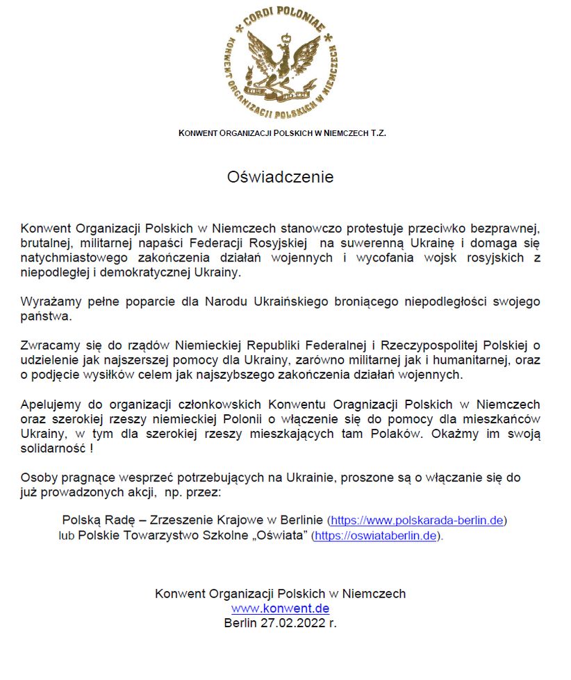 Konwent Organizacji Polskich w Niemczech stanowczo protestuje przeciwko bezprawnej, brutalnej, militarnej napaści Federacji Rosyjskiej na suwerenną Ukrainę i domaga się natychmiastowego zakończenia działań wojennych i wycofania wojsk rosyjskich z niepodległej i demokratycznej Ukrainy.