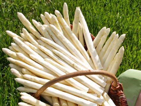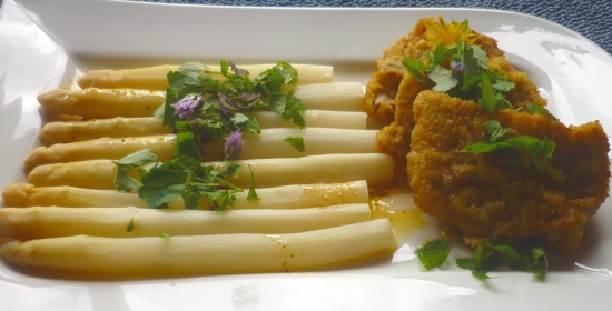 Frau Stieg wie najlepiej jak je gotować w bawełnianą nitkę powiązane, główkami do góry, w garnkach specjalnych z odrobiną cukru , solą morską i masłem co z łyżki się leje na parę gorącą niczym oliwa rzymskich cesarzy. Do tego holenderski z białym winem i żółtkami ubitymi, i znowu to masło najświeższe i szafranu odrobina... Ach! Wszystkiego nie zdradzi, nawet tego, skąd szynkę tak wspaniałą, lekko podwędzaną różową i w listki skrojoną nabywa. Szynka zrulowana musi być. Przy tym młode ziemniaki z Heide, spod Lueneburga pod koperkową pierzynką... Na deser rabarbar z kisielem i śmietaną bitą i wino białe, kawusia...