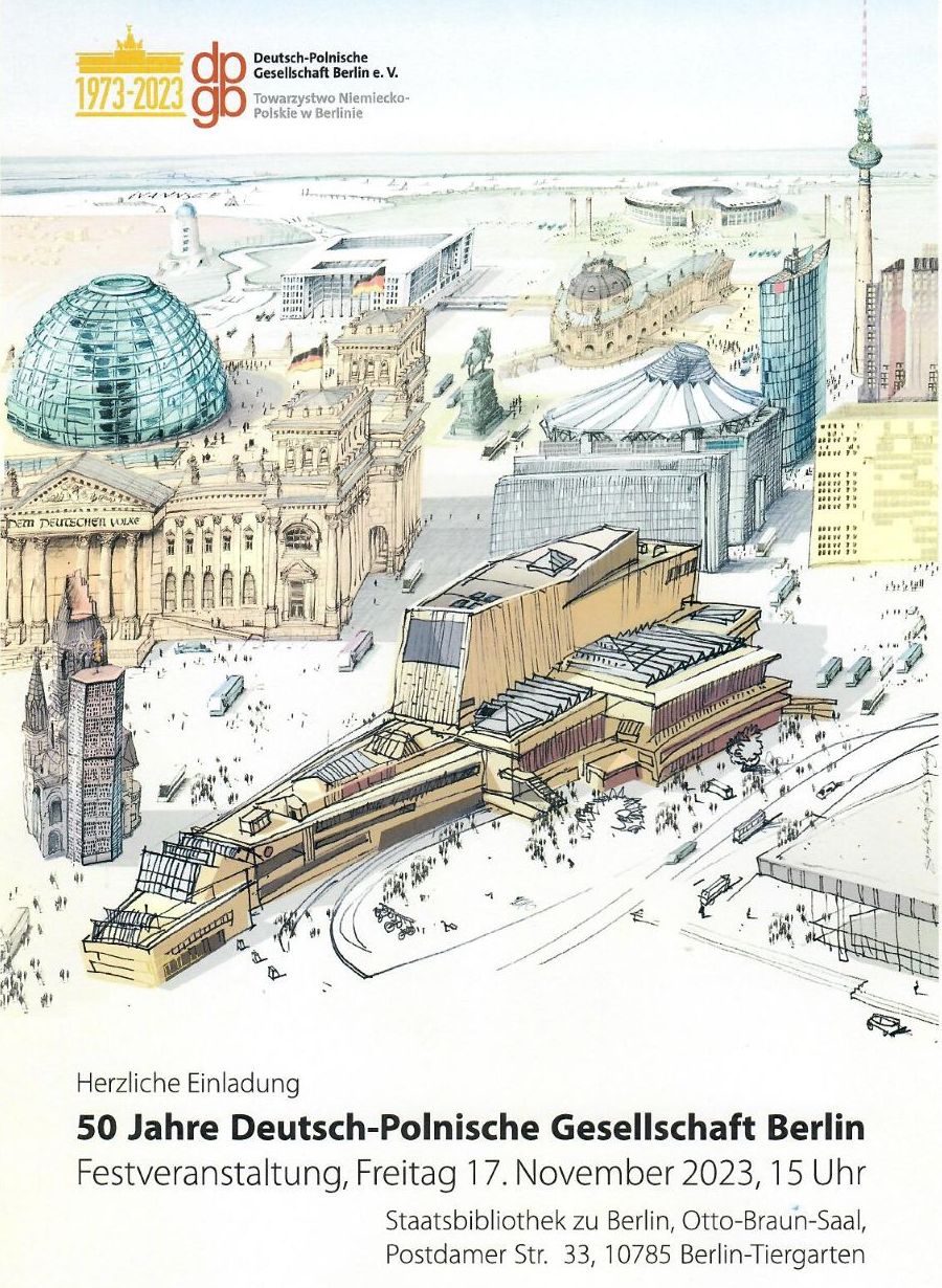 W piątek 17 listopada 2023 r. o godz. 15.00 rozpocznie się oficjalna uroczystość z okazji 50-lecia naszego berlińskiego towarzystwa. Zapraszamy wszystkie organizacje o polskim, niemieckim i polsko-niemieckim rodowodzie oraz wszystkie zainteresowane osoby. Uroczystość odbędzie się w Otto-Braun-Saal Berlińskiej Biblioteki Państwowej, Potsdamer Str. 33, 10785 Berlin-Tiergarten.