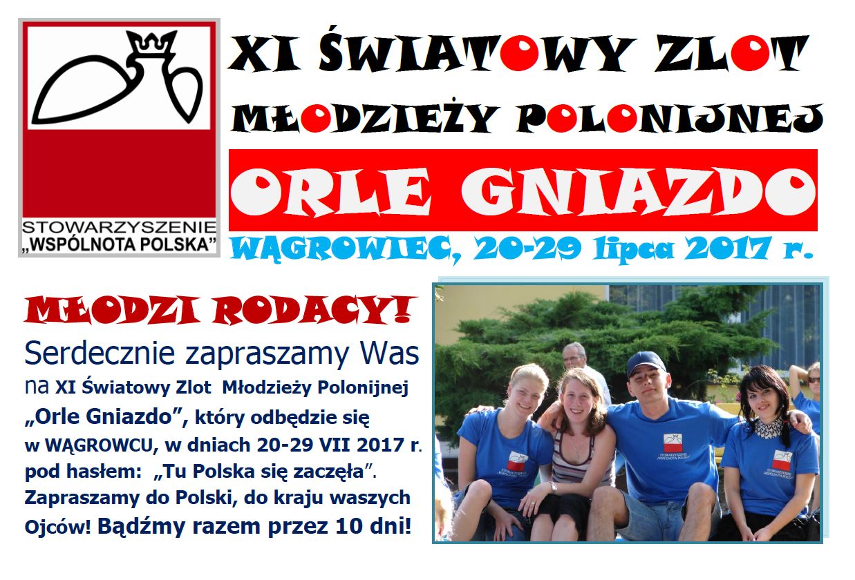 Wielkopolski Oddział Stowarzyszenia "Wspólnota Polska" w Poznaniu zaprasza młodzież polonijną do Polski, na XI Światowy Zlot Młodzieży Polonijnej "ORLE GNIAZDO 2017", który odbędzie się terminie od 20 lipca do 29 lipca br. w Wągrowcu koło Poznania.