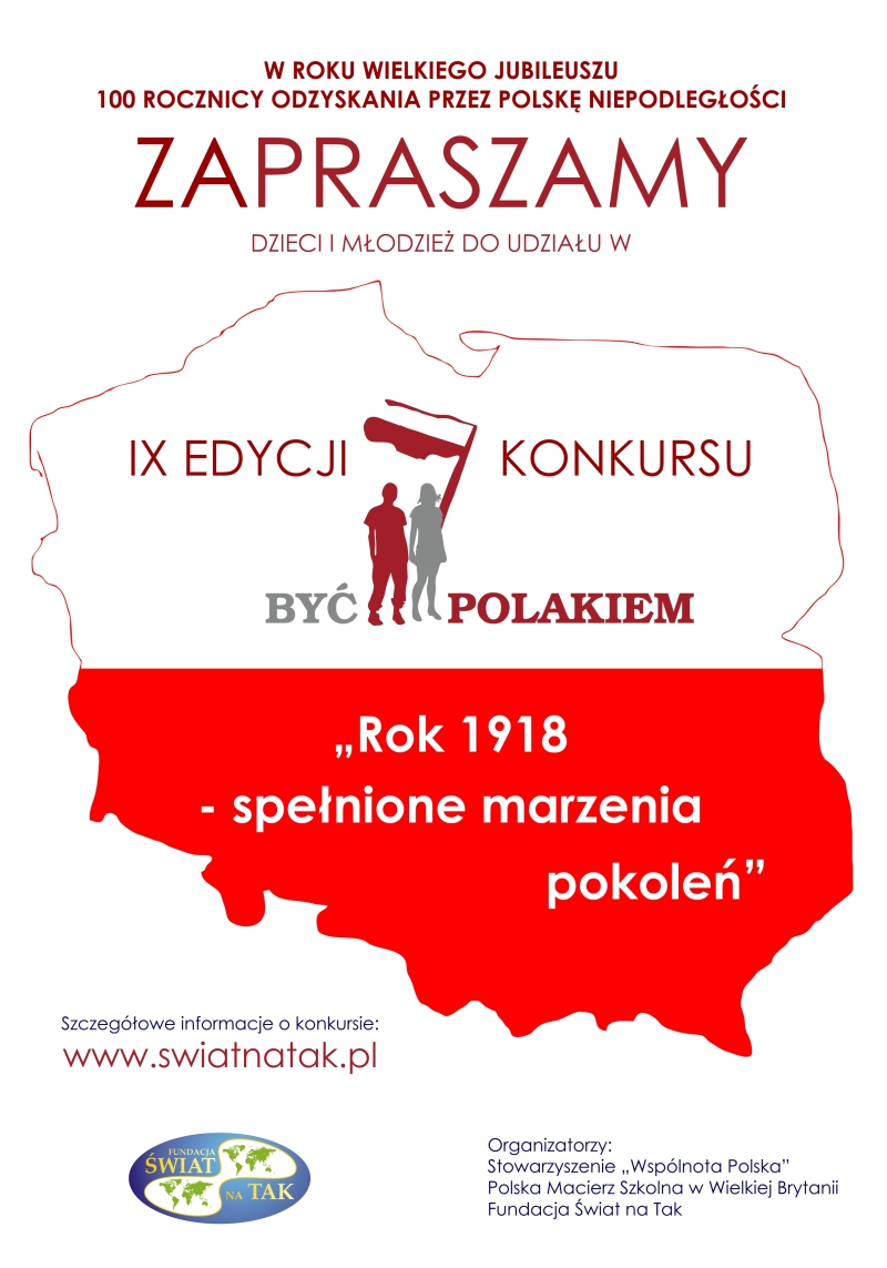 „Rok 1918-spełnione marzenia pokoleń” to temat, który ma zadanie połączyć pokolenia nauczyciela-wychowawcę i ucznia, mieszkających poza granicami kraju. Dlatego w tym roku formuła konkursu została poszerzona o moduł „B”- dla nauczycieli na stworzenie konspektu lekcji. Dla dzieci i młodzieży przeznaczony jest moduł „A”, gdzie wzorem lat poprzednich zapraszamy do tworzenia prac plastycznych, literackich i multimedialnych. Szczegółowe informacje znajdą Państwo na stronie internetowej: www.swiatnatak.pl